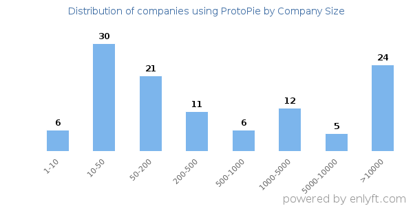 We have data on 117 companies that use ProtoPie. The companies using ProtoPie are most often found in United States and in the Information Technology and Services industry. ProtoPie is most often used by companies with 10-50 employees and >1000M dollars in revenue. Our data for ProtoPie usage goes back as far as 1 years and 10 months.