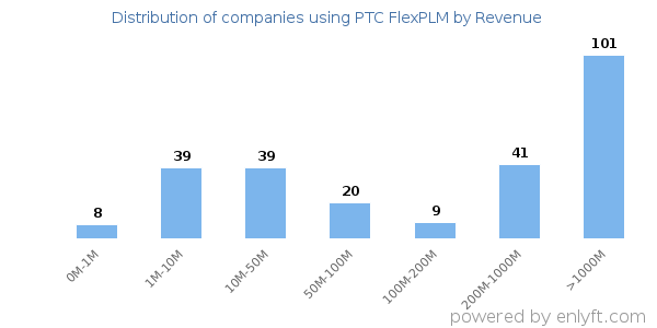Of all the customers that are using PTC FlexPLM, a majority (52%) are large (>$1000M), 30% are small (<$50M) and 8% are medium-sized.