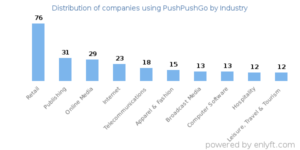 Looking at PushPushGo customers by industry, we find that Retail (13%), Publishing (5%) and Online Media (5%) are the largest segments.