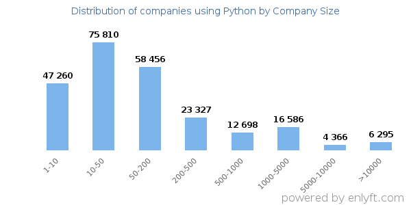 We have data on 263,101 companies that use Python. The companies using Python are most often found in United States and in the Information Technology and Services industry. Python is most often used by companies with 10-50 employees and 1M-10M dollars in revenue. Our data for Python usage goes back as far as 9 years and 11 months.