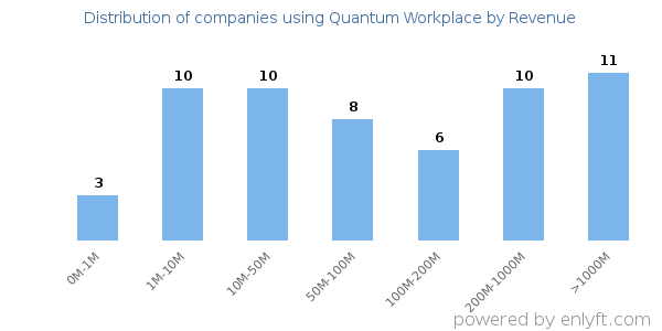 We have data on 59 companies that use Quantum Workplace. The companies using Quantum Workplace are most often found in United States and in the Hospital & Health Care industry. Quantum Workplace is most often used by companies with 1000-5000 employees and >1000M dollars in revenue. Our data for Quantum Workplace usage goes back as far as 6 years.