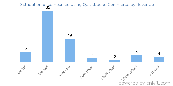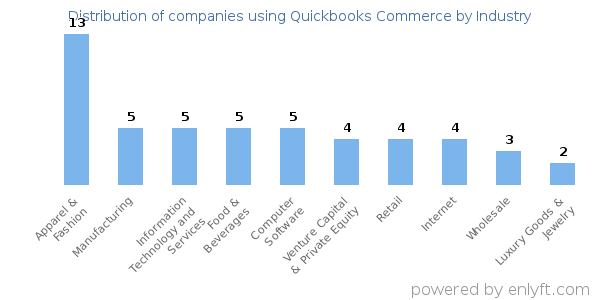 We have data on 75 companies that use Quickbooks Commerce. The companies using Quickbooks Commerce are most often found in United States and in the Apparel & Fashion industry. Quickbooks Commerce is most often used by companies with 10-50 employees and 1M-10M dollars in revenue. Our data for Quickbooks Commerce usage goes back as far as 4 years and 7 months.