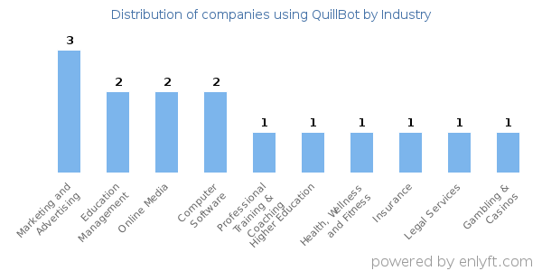 Looking at QuillBot customers by industry, we find that Marketing and Advertising (10%), Education Management (6%), Online Media (6%) and Computer Software (6%) are the largest segments.