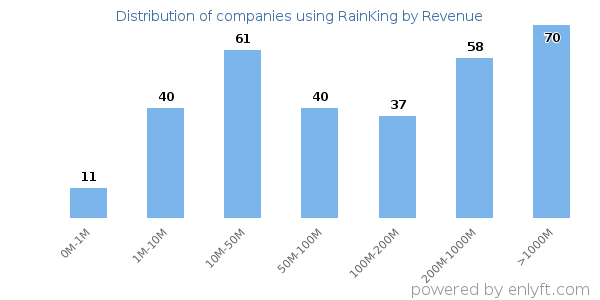 We have data on 324 companies that use RainKing. The companies using RainKing are most often found in United States and in the Information Technology and Services industry. RainKing is most often used by companies with 50-200 employees and >1000M dollars in revenue. Our data for RainKing usage goes back as far as 10 years and 1 months.