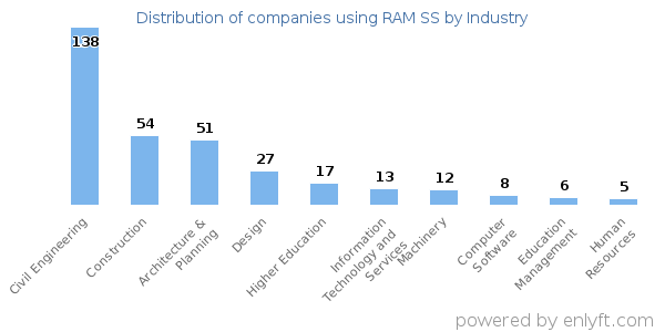 We have data on 417 companies that use RAM SS. The companies using RAM SS are most often found in United States and in the Civil Engineering industry. RAM SS is most often used by companies with 10-50 employees and 1M-10M dollars in revenue. Our data for RAM SS usage goes back as far as 9 years and 11 months.