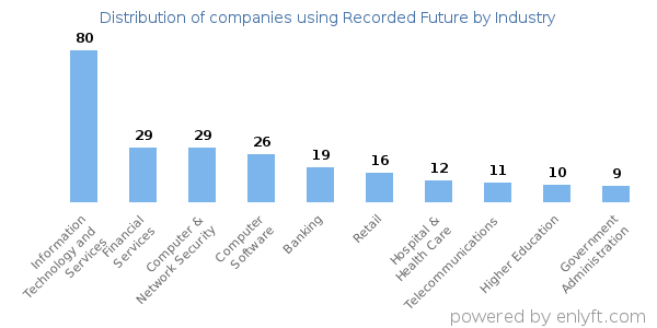 We have data on 408 companies that use Recorded Future. The companies using Recorded Future are most often found in United States and in the Information Technology and Services industry. Recorded Future is most often used by companies with >10000 employees and >1000M dollars in revenue. Our data for Recorded Future usage goes back as far as 8 years and 3 months.