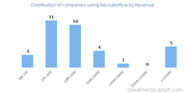 Of all the customers that are using Recruiterflow, a majority (61%) are small (<$50M), 12% are large (>$1000M) and 9% are medium-sized.
