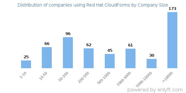 We have data on 570 companies that use Red Hat CloudForms. The companies using Red Hat CloudForms are most often found in United States and in the Information Technology and Services industry. Red Hat CloudForms is most often used by companies with >10000 employees and >1000M dollars in revenue. Our data for Red Hat CloudForms usage goes back as far as 9 years and 7 months.