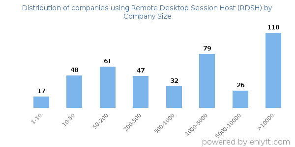 We have data on 428 companies that use Remote Desktop Session Host (RDSH). The companies using Remote Desktop Session Host (RDSH) are most often found in United States and in the Information Technology and Services industry. Remote Desktop Session Host (RDSH) is most often used by companies with >10000 employees and >1000M dollars in revenue. Our data for Remote Desktop Session Host (RDSH) usage goes back as far as 4 years and 9 months.