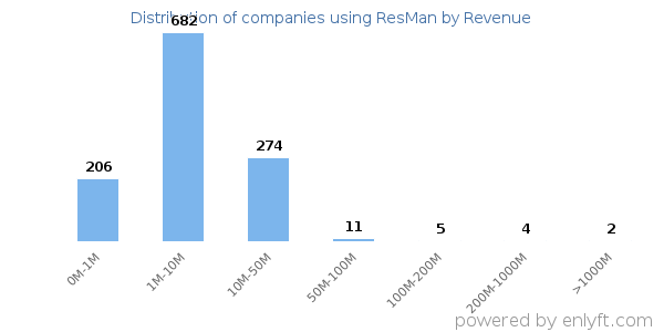 Of all the customers that are using ResMan, a majority (79%) are small (<$50M), 0% are large (>$1000M) and 10% are medium-sized.