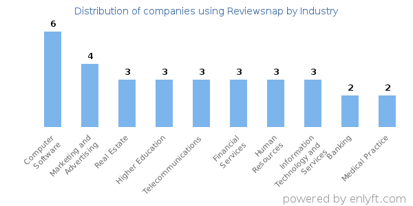 We have data on 64 companies that use Reviewsnap. The companies using Reviewsnap are most often found in United States and in the Computer Software industry. Reviewsnap is most often used by companies with 50-200 employees and 10M-50M dollars in revenue. Our data for Reviewsnap usage goes back as far as 8 years and 5 months.