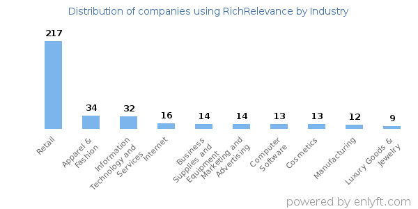 We have data on 607 companies that use RichRelevance. The companies using RichRelevance are most often found in United States and in the Retail industry. RichRelevance is most often used by companies with 1-10 employees and >1000M dollars in revenue. Our data for RichRelevance usage goes back as far as 8 years and 3 months.