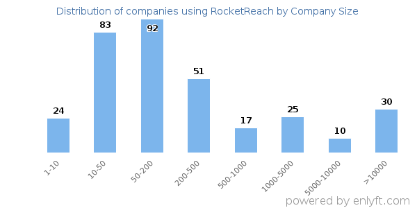 We have data on 335 companies that use RocketReach. The companies using RocketReach are most often found in United States and in the Information Technology and Services industry. RocketReach is most often used by companies with 50-200 employees and 1M-10M dollars in revenue. Our data for RocketReach usage goes back as far as 8 years and 2 months.