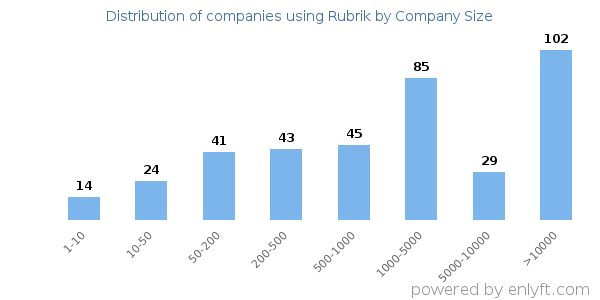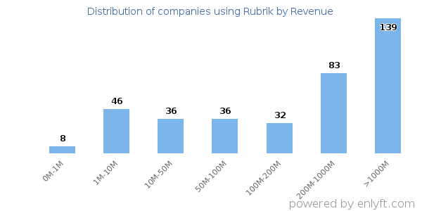We have data on 390 companies that use Rubrik. The companies using Rubrik are most often found in United States and in the Information Technology and Services industry. Rubrik is most often used by companies with >10000 employees and >1000M dollars in revenue. Our data for Rubrik usage goes back as far as 4 years and 1 months.