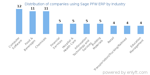 We have data on 142 companies that use Sage PFW ERP. The companies using Sage PFW ERP are most often found in United States and in the Computer Software industry. Sage PFW ERP is most often used by companies with 50-200 employees and 10M-50M dollars in revenue. Our data for Sage PFW ERP usage goes back as far as 10 years and 3 months.