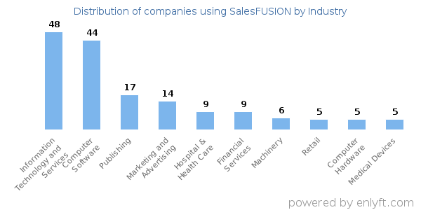 We have data on 303 companies that use SalesFUSION. The companies using SalesFUSION are most often found in United States and in the Information Technology and Services industry. SalesFUSION is most often used by companies with 50-200 employees and 10M-50M dollars in revenue. Our data for SalesFUSION usage goes back as far as 10 years and 1 months.