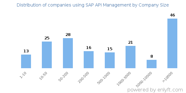 We have data on 179 companies that use SAP API Management. The companies using SAP API Management are most often found in United States and in the Information Technology and Services industry. SAP API Management is most often used by companies with >10000 employees and >1000M dollars in revenue. Our data for SAP API Management usage goes back as far as 8 years and 11 months.