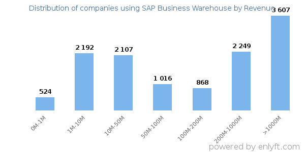 We have data on 13,603 companies that use SAP Business Warehouse. The companies using SAP Business Warehouse are most often found in United States and in the Information Technology and Services industry. SAP Business Warehouse is most often used by companies with 1000-5000 employees and >1000M dollars in revenue. Our data for SAP Business Warehouse usage goes back as far as 8 years and 3 months.