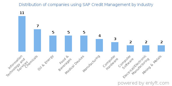 Looking at SAP Credit Management customers by industry, we find that Information Technology and Services (15%), Chemicals (9%), Oil & Energy (6%), Food & Beverages (6%) and Medical Devices (6%) are the largest segments.