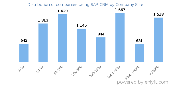 We have data on 9,640 companies that use SAP CRM. The companies using SAP CRM are most often found in United States and in the Information Technology and Services industry. SAP CRM is most often used by companies with 1000-5000 employees and >1000M dollars in revenue. Our data for SAP CRM usage goes back as far as 10 years and 2 months.