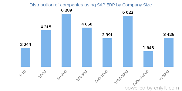 Of all the customers that are using SAP ERP, 20% are small (<50 employees), 44% are medium-sized and 36% are large (>1000 employees).