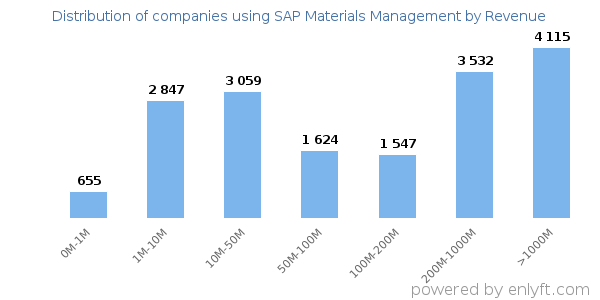 We have data on 18,848 companies that use SAP Materials Management. The companies using SAP Materials Management are most often found in United States and in the Information Technology and Services industry. SAP Materials Management is most often used by companies with 1000-5000 employees and >1000M dollars in revenue. Our data for SAP Materials Management usage goes back as far as 9 years and 11 months.