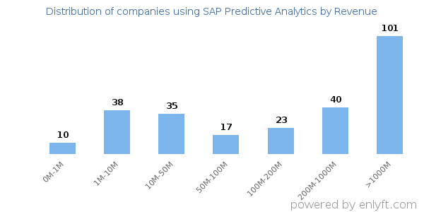 We have data on 273 companies that use SAP Predictive Analytics. The companies using SAP Predictive Analytics are most often found in United States and in the Information Technology and Services industry. SAP Predictive Analytics is most often used by companies with >10000 employees and >1000M dollars in revenue. Our data for SAP Predictive Analytics usage goes back as far as 7 years and 9 months.