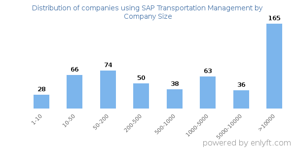 We have data on 540 companies that use SAP Transportation Management. The companies using SAP Transportation Management are most often found in United States and in the Information Technology and Services industry. SAP Transportation Management is most often used by companies with >10000 employees and >1000M dollars in revenue. Our data for SAP Transportation Management usage goes back as far as 7 years and 9 months.