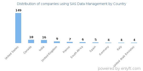We have data on 254 companies that use SAS Data Management. The companies using SAS Data Management are most often found in United States and in the Information Technology and Services industry. SAS Data Management is most often used by companies with >10000 employees and >1000M dollars in revenue. Our data for SAS Data Management usage goes back as far as 2 years and 6 months.