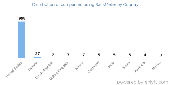 We have data on 1,406 companies that use SatisMeter. The companies using SatisMeter are most often found in United States and in the Real Estate industry. SatisMeter is most often used by companies with 1-10 employees and 1M-10M dollars in revenue. Our data for SatisMeter usage goes back as far as 8 years and 5 months.