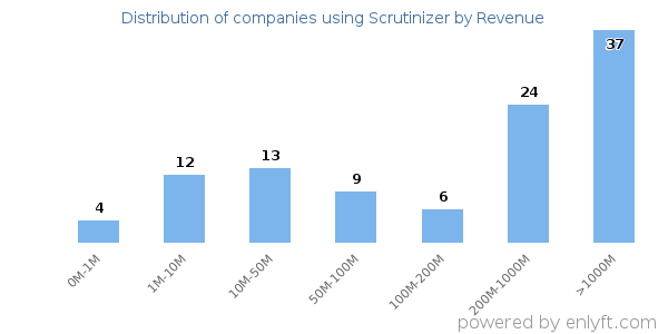 We have data on 110 companies that use Scrutinizer. The companies using Scrutinizer are most often found in United States and in the Information Technology and Services industry. Scrutinizer is most often used by companies with 1000-5000 employees and >1000M dollars in revenue. Our data for Scrutinizer usage goes back as far as 10 years and 1 months.