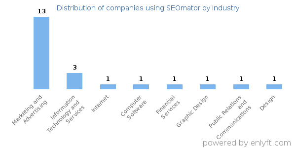 We have data on 24 companies that use SEOmator. The companies using SEOmator are most often found in United States and in the Marketing and Advertising industry. SEOmator is most often used by companies with 1-10 employees and 1M-10M dollars in revenue. Our data for SEOmator usage goes back as far as 8 years and 2 months.