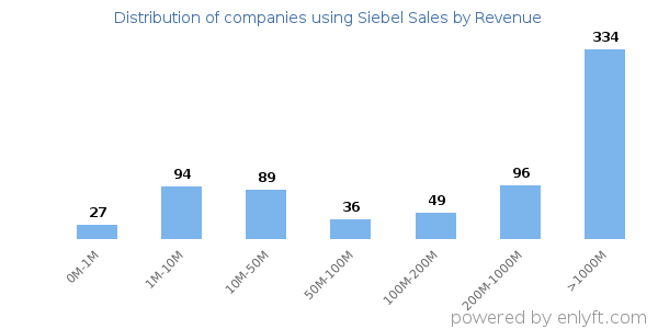 We have data on 750 companies that use Siebel Sales. The companies using Siebel Sales are most often found in United States and in the Information Technology and Services industry. Siebel Sales is most often used by companies with >10000 employees and >1000M dollars in revenue. Our data for Siebel Sales usage goes back as far as 10 years and 1 months.