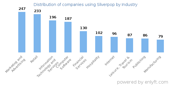 We have data on 3,182 companies that use Silverpop. The companies using Silverpop are most often found in United States and in the Marketing and Advertising industry. Silverpop is most often used by companies with 50-200 employees and 1M-10M dollars in revenue. Our data for Silverpop usage goes back as far as 10 years and 3 months.