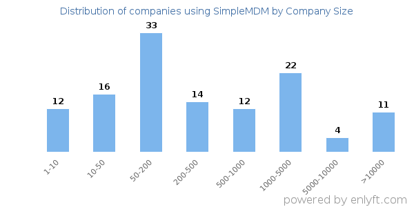 We have data on 126 companies that use SimpleMDM. The companies using SimpleMDM are most often found in United States and in the Information Technology and Services industry. SimpleMDM is most often used by companies with 50-200 employees and 10M-50M dollars in revenue. Our data for SimpleMDM usage goes back as far as 4 years and 3 months.