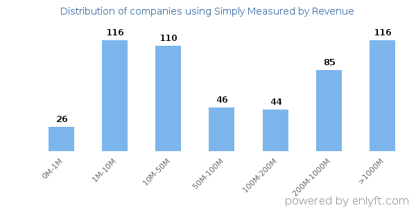 We have data on 567 companies that use Simply Measured. The companies using Simply Measured are most often found in United States and in the Marketing and Advertising industry. Simply Measured is most often used by companies with 50-200 employees and >1000M dollars in revenue. Our data for Simply Measured usage goes back as far as 6 years.