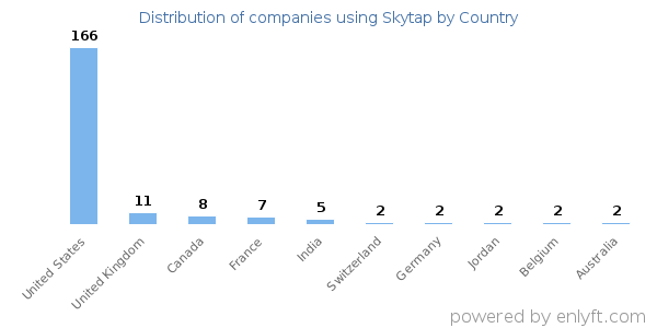 We have data on 222 companies that use Skytap. The companies using Skytap are most often found in United States and in the Information Technology and Services industry. Skytap is most often used by companies with >10000 employees and >1000M dollars in revenue. Our data for Skytap usage goes back as far as 8 years and 5 months.