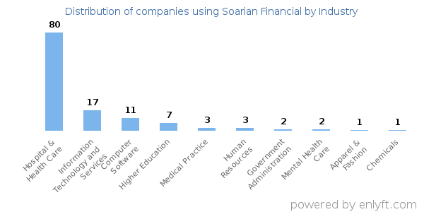 Looking at Soarian Financial customers by industry, we find that Hospital & Health Care (55%), Information Technology and Services (11%) and Computer Software (7%) are the largest segments.
