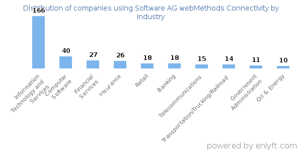 We have data on 531 companies that use Software AG webMethods Connectivity. The companies using Software AG webMethods Connectivity are most often found in United States and in the Information Technology and Services industry. Software AG webMethods Connectivity is most often used by companies with >10000 employees and >1000M dollars in revenue. Our data for Software AG webMethods Connectivity usage goes back as far as 6 years.