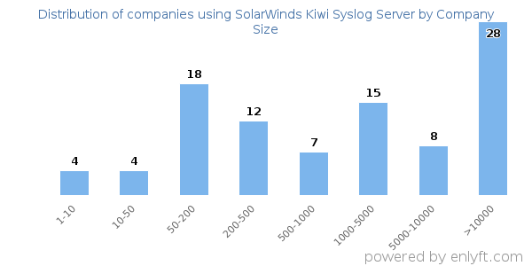 We have data on 96 companies that use SolarWinds Kiwi Syslog Server. The companies using SolarWinds Kiwi Syslog Server are most often found in United States and in the Information Technology and Services industry. SolarWinds Kiwi Syslog Server is most often used by companies with >10000 employees and >1000M dollars in revenue. Our data for SolarWinds Kiwi Syslog Server usage goes back as far as 2 years and 1 months.