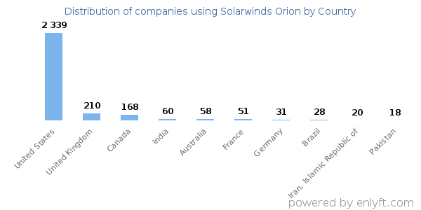 We have data on 3,383 companies that use Solarwinds Orion. The companies using Solarwinds Orion are most often found in United States and in the Information Technology and Services industry. Solarwinds Orion is most often used by companies with 1000-5000 employees and >1000M dollars in revenue. Our data for Solarwinds Orion usage goes back as far as 4 years and 11 months.