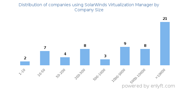 We have data on 63 companies that use SolarWinds Virtualization Manager. The companies using SolarWinds Virtualization Manager are most often found in United States and in the Information Technology and Services industry. SolarWinds Virtualization Manager is most often used by companies with >10000 employees and >1000M dollars in revenue. Our data for SolarWinds Virtualization Manager usage goes back as far as 8 years and 3 months.