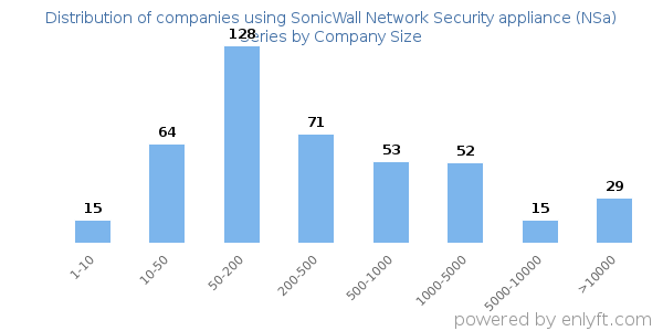 We have data on 438 companies that use SonicWall Network Security appliance (NSa) Series. The companies using SonicWall Network Security appliance (NSa) Series are most often found in United States and in the Information Technology and Services industry. SonicWall Network Security appliance (NSa) Series is most often used by companies with 50-200 employees and 10M-50M dollars in revenue. Our data for SonicWall Network Security appliance (NSa) Series usage goes back as far as 3 years and 4 months.