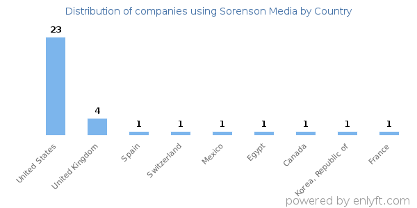 We have data on 34 companies that use Sorenson Media. The companies using Sorenson Media are most often found in United States and in the Computer Software industry. Sorenson Media is most often used by companies with 50-200 employees and 10M-50M dollars in revenue. Our data for Sorenson Media usage goes back as far as 10 years and 1 months.