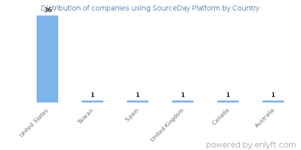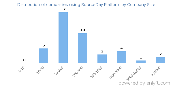 We have data on 43 companies that use SourceDay Platform. The companies using SourceDay Platform are most often found in United States and in the Machinery industry. SourceDay Platform is most often used by companies with 50-200 employees and 10M-50M dollars in revenue. Our data for SourceDay Platform usage goes back as far as 3 years and 3 months.