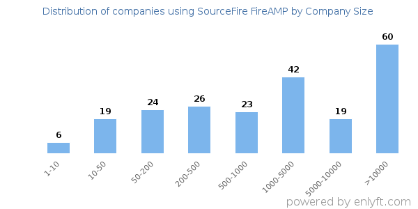 Of all the customers that are using SourceFire FireAMP, a majority (58%) are large (>$1000M), 20% are small (<$50M) and 16% are medium-sized.