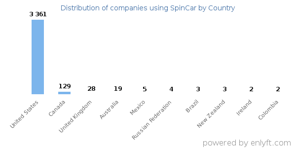 We have data on 3,650 companies that use SpinCar. The companies using SpinCar are most often found in United States and in the Automotive industry. SpinCar is most often used by companies with 10-50 employees and 10M-50M dollars in revenue. Our data for SpinCar usage goes back as far as 5 years and 2 months.
