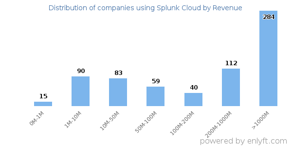 Of all the customers that are using Splunk Cloud, a majority (56%) are large (>$1000M), 25% are small (<$50M) and 15% are medium-sized.