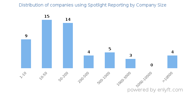 We have data on 56 companies that use Spotlight Reporting. The companies using Spotlight Reporting are most often found in New Zealand and in the Accounting industry. Spotlight Reporting is most often used by companies with 10-50 employees and 1M-10M dollars in revenue. Our data for Spotlight Reporting usage goes back as far as 3 years and 2 months.