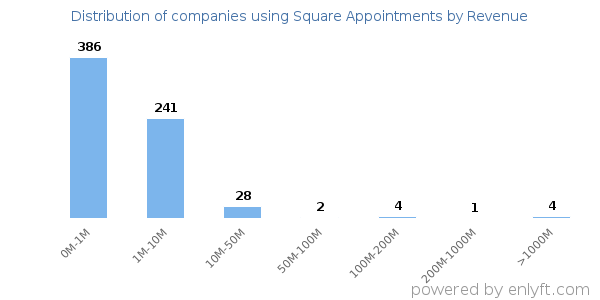 We have data on 921 companies that use Square Appointments. The companies using Square Appointments are most often found in United States and in the Consumer Services industry. Square Appointments is most often used by companies with 1-10 employees and 0M-1M dollars in revenue. Our data for Square Appointments usage goes back as far as 3 years and 4 months.